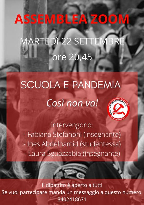 Sono in campo in Italia importanti iniziative di sciopero e di protesta: il 24 e il 25 settembre i sindacati di base hanno proclamato due giorni di sciopero. È particolarmente significativa la giornata del 25 settembre, che vedrà scendere in sciopero più settori lavorativi - scuola, educatori, sanità, trasporti – al fianco degli studenti del Friday For Future. Anche il 26 settembre sono in calendario iniziative di protesta a difesa della scuola pubblica. Il nostro Partito, anche in vista di quelle giornate, organizza un’assemblea pubblica nazionale su zoom il 22 settembre alle 20,45: vi invitiamo a partecipare e a confrontarvi con noi su come sia possibile garantire diritto all’istruzione e diritto alla salute.