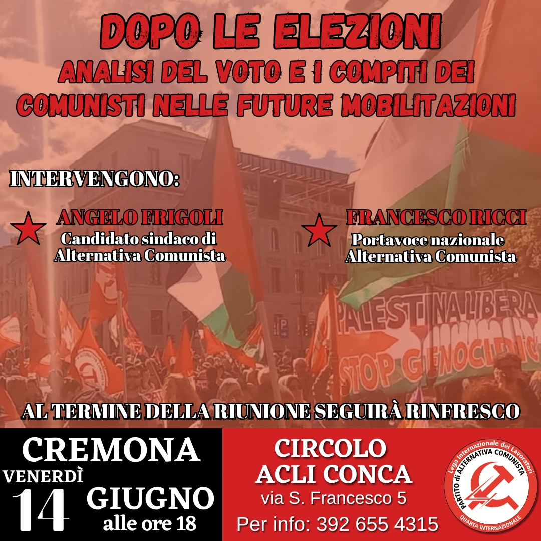 Da subito avevamo annunciato che ciò che serve è costruire un'opposizione di classe, dei lavoratori e dei giovani e che per questo anche in caso di ballottaggio non avremmo dato indicazione di voto per il cosiddetto schieramento progressista, capitanato dal Pd, da anni al governo di Cremona al servizio dei padroni della città. E così sarà. Il risultato anche numerico del partito (1,3%, pari a 400 voti) è un piccolo capitale di simpatia per la nostra lotta che investiremo, insieme ai compagni e alle compagne che in questo periodo si sono avvicinati al partito e, in vari casi, hanno deciso di iniziare a fare militanza.