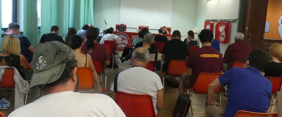 I lavori del VI Congresso hanno avuto inizio venerdì 8 luglio con il saluto di Daniele Cofani, figura simbolo della lotta in Alitalia. Daniele ha ricordato l’importanza di costruire una direzione rivoluzionaria internazionale per salvare l’umanità dalla catastrofe. Ha ricordato le mobilitazioni in corso in altri Paesi, dall’Ecuador all’Africa, fino alla gloriosa resistenza ucraina (e proprio in quelle ore giungevano notizie dell’assalto al palazzo presidenziale in Sri Lanka). Daniele ha ricordato anche, con orgoglio, che la nostra organizzazione internazionale è stata l’unica a prendere una posizione di netto sostegno alla lotta di liberazione nazionale del popolo ucraino contro l’invasione militare russa, nella piena indipendenza dal governo Zelensky e contro l’intervento Nato.